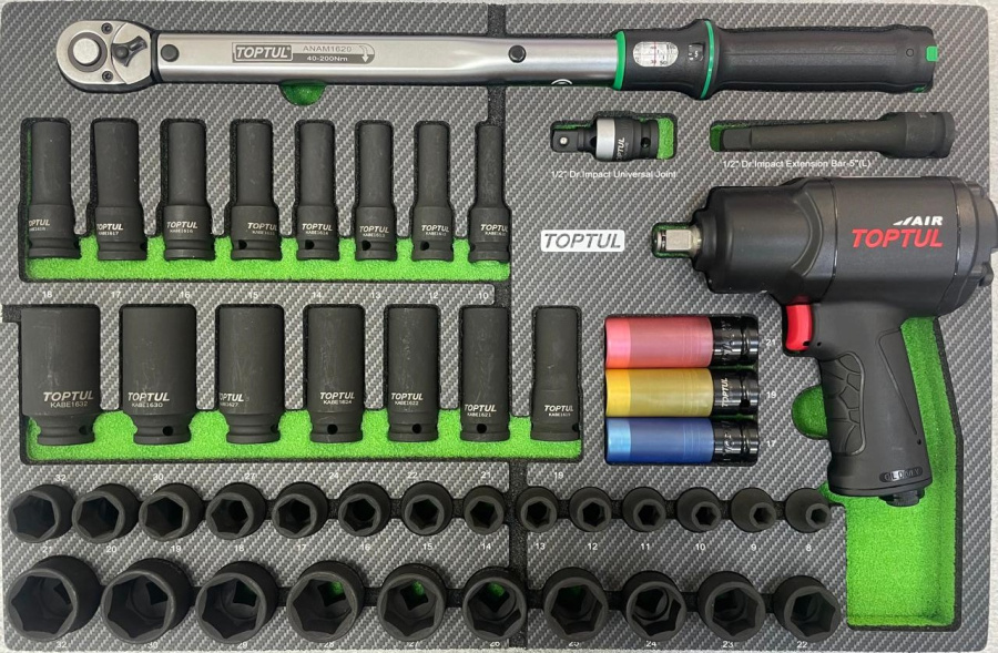Набор инструментов 46 пр., гайковерт, ударные головки и динамометрический ключ, в ложементе. TOPTUL