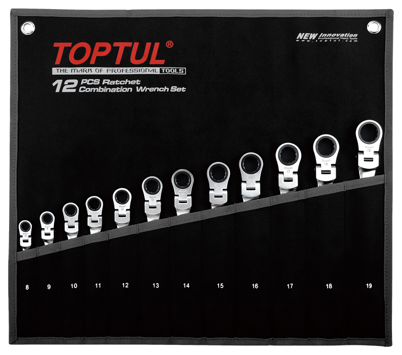 Приобрести Набор ключей комбинированных трещоточных шарнирных 8-19 мм, 12 предметов на полотне TOPTUL GPAQ1204 от компании Toptul (Тайвань) из раздела Трещоточные ключи по цене 19 774 рублей.
